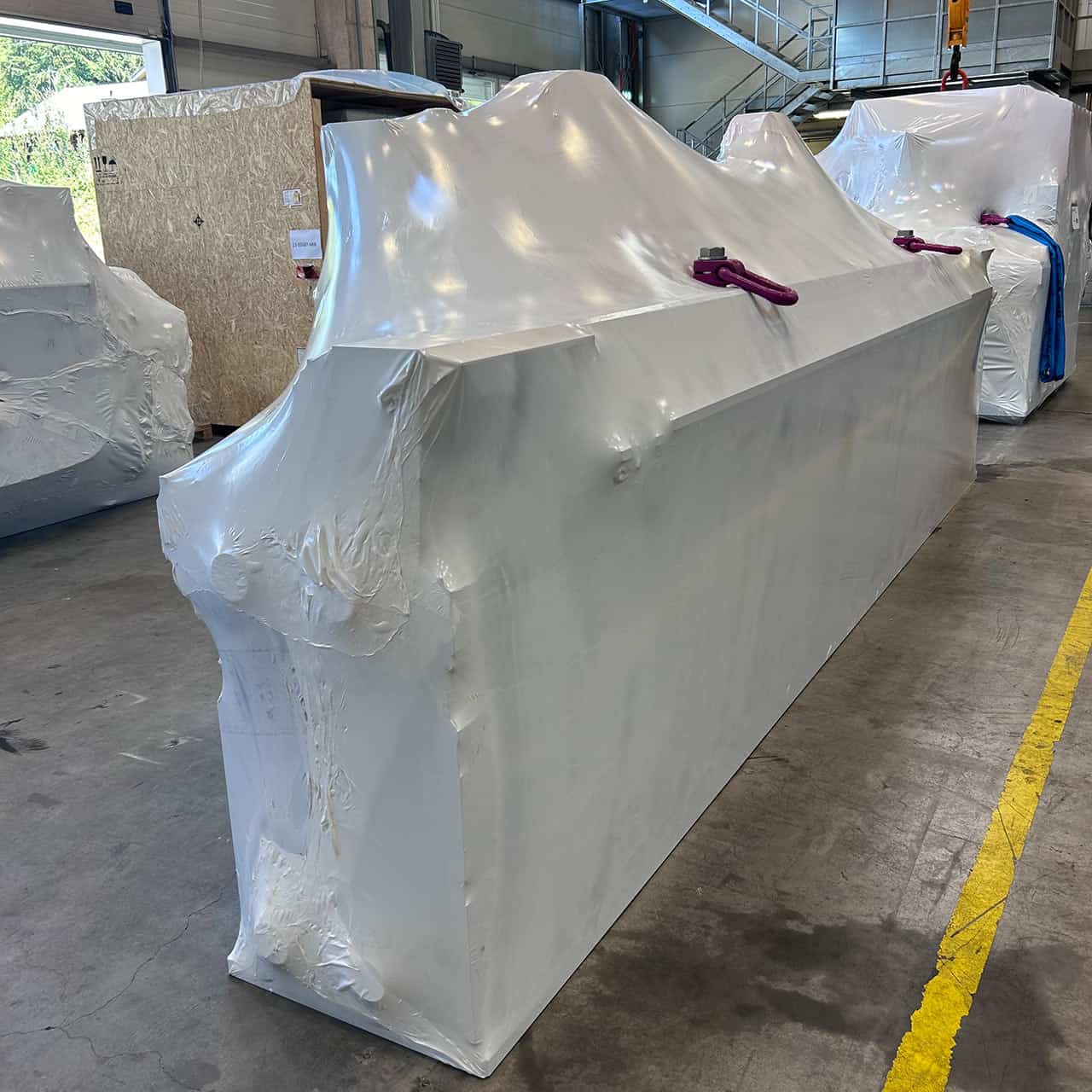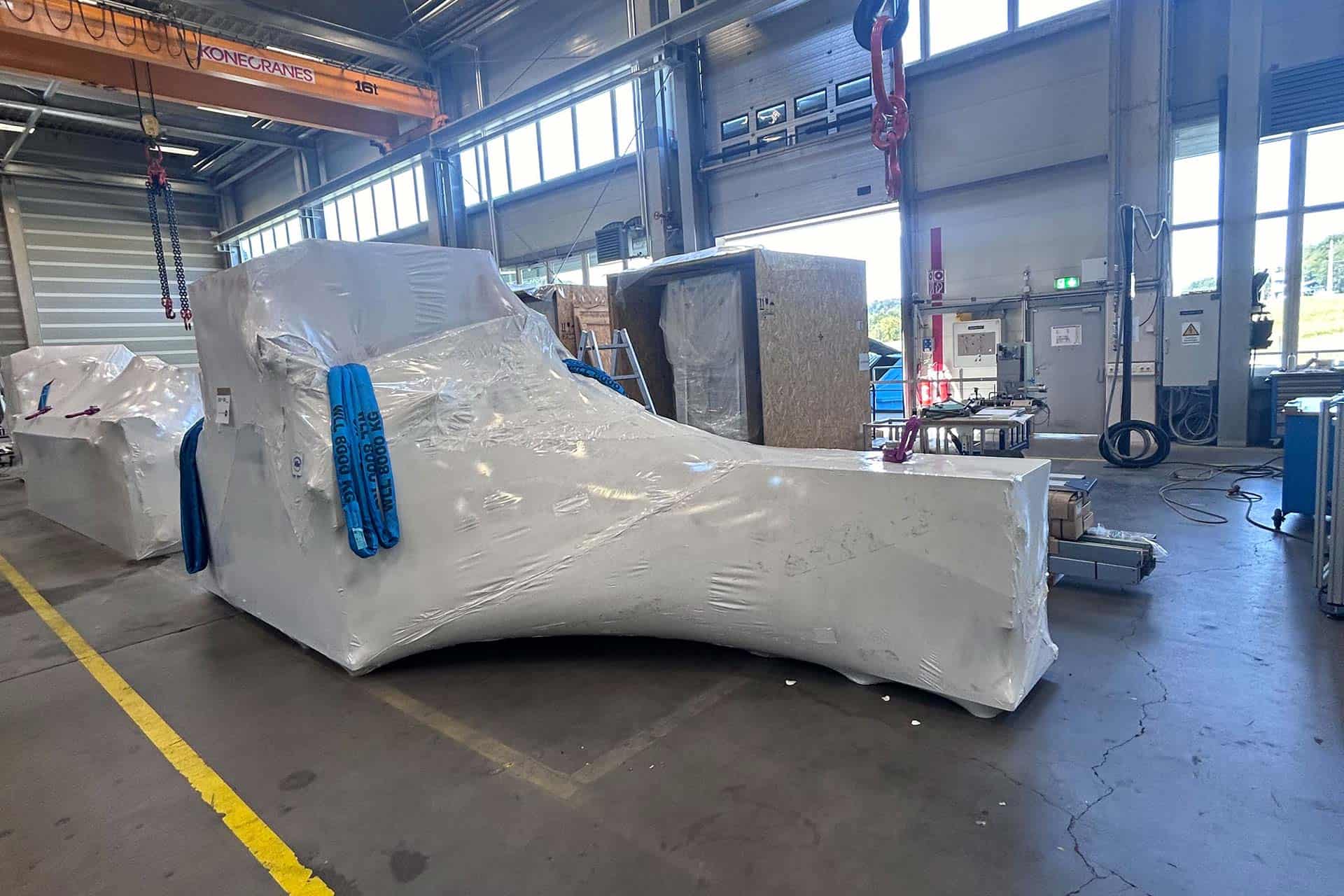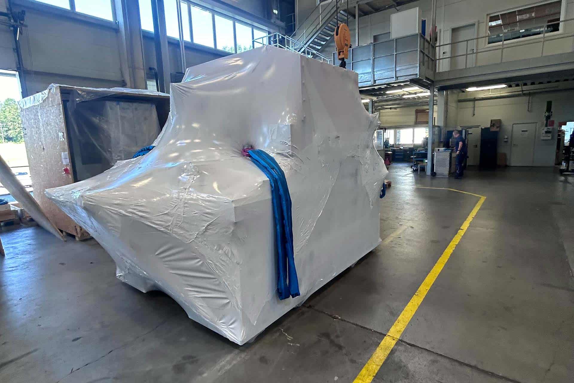 Für den Transport einer hochpräzisen Fräsanlage entwickelten wir eine robuste Verpackungslösung mit Kisten und Schrumpffolie mit einem Lieferumfang von 6 Colli. Die Fräsanlage ist eine empfindliche Maschine, die während des Transports besonders geschützt werden muss. Zudem erforderte das hohe Gewicht von 80 Tonnen spezielle Schwergutkisten und Hebemittel für sicheres Handling und Verladung.