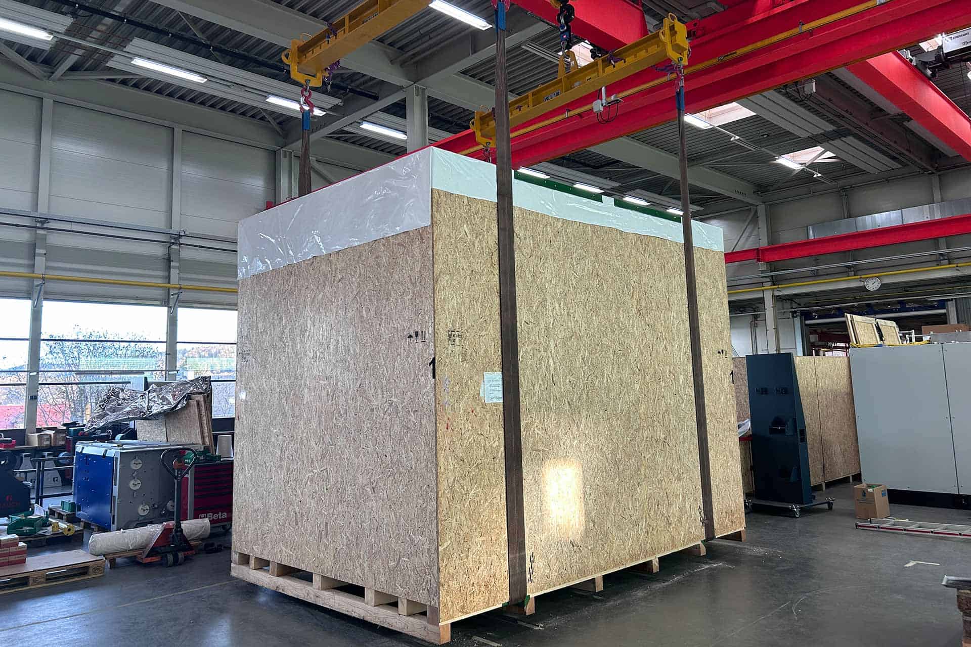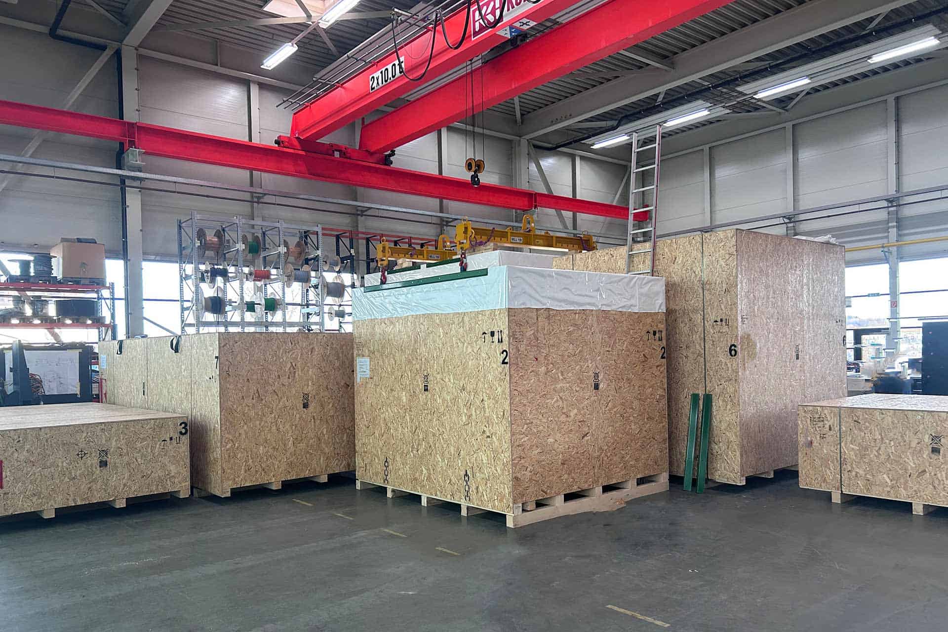 Für den optimalen Schutz während des Transports wurden die Anlagenteile in speziell gefertigten Schwergutkisten verpackt. Diese sorgen für: